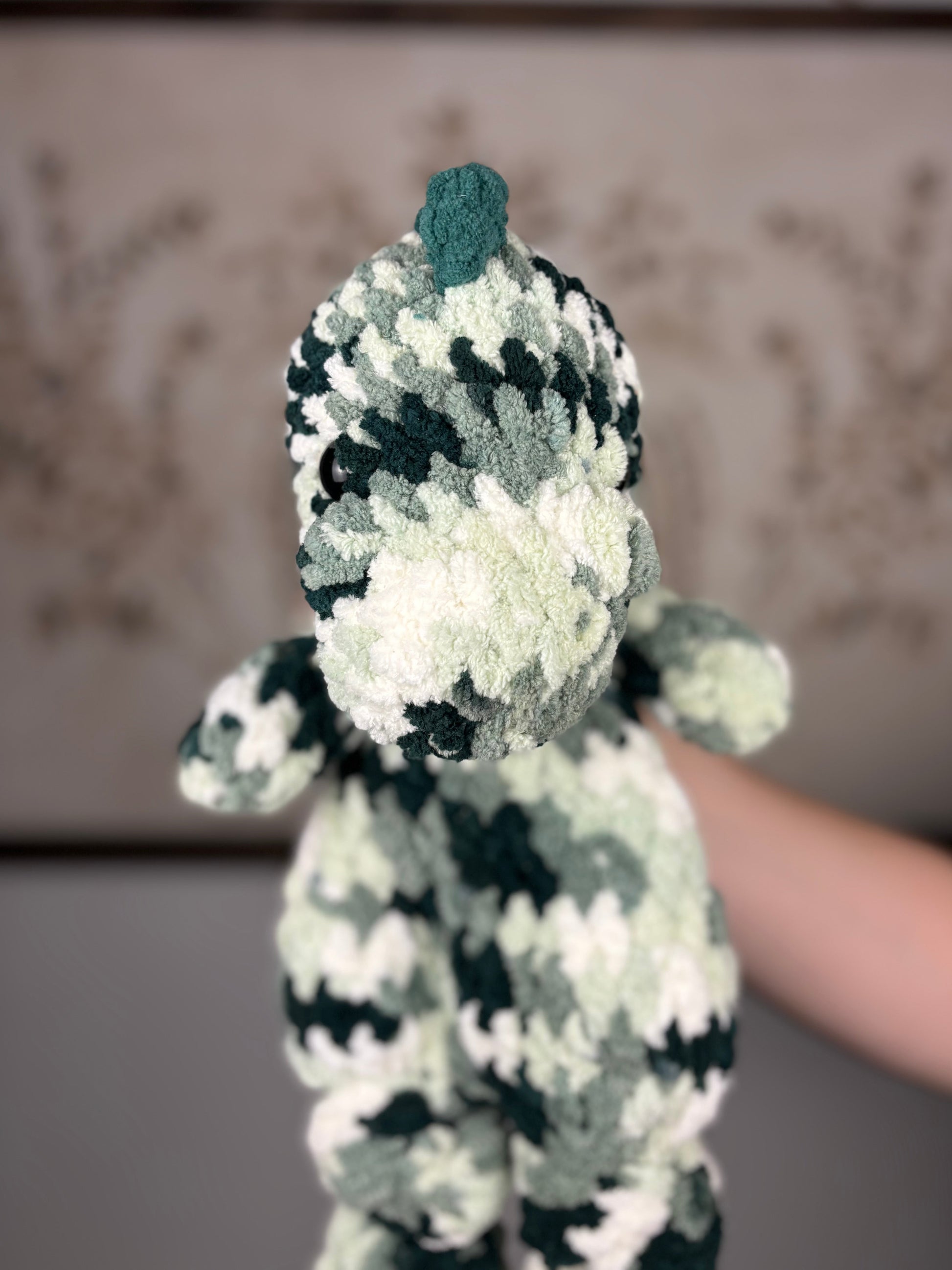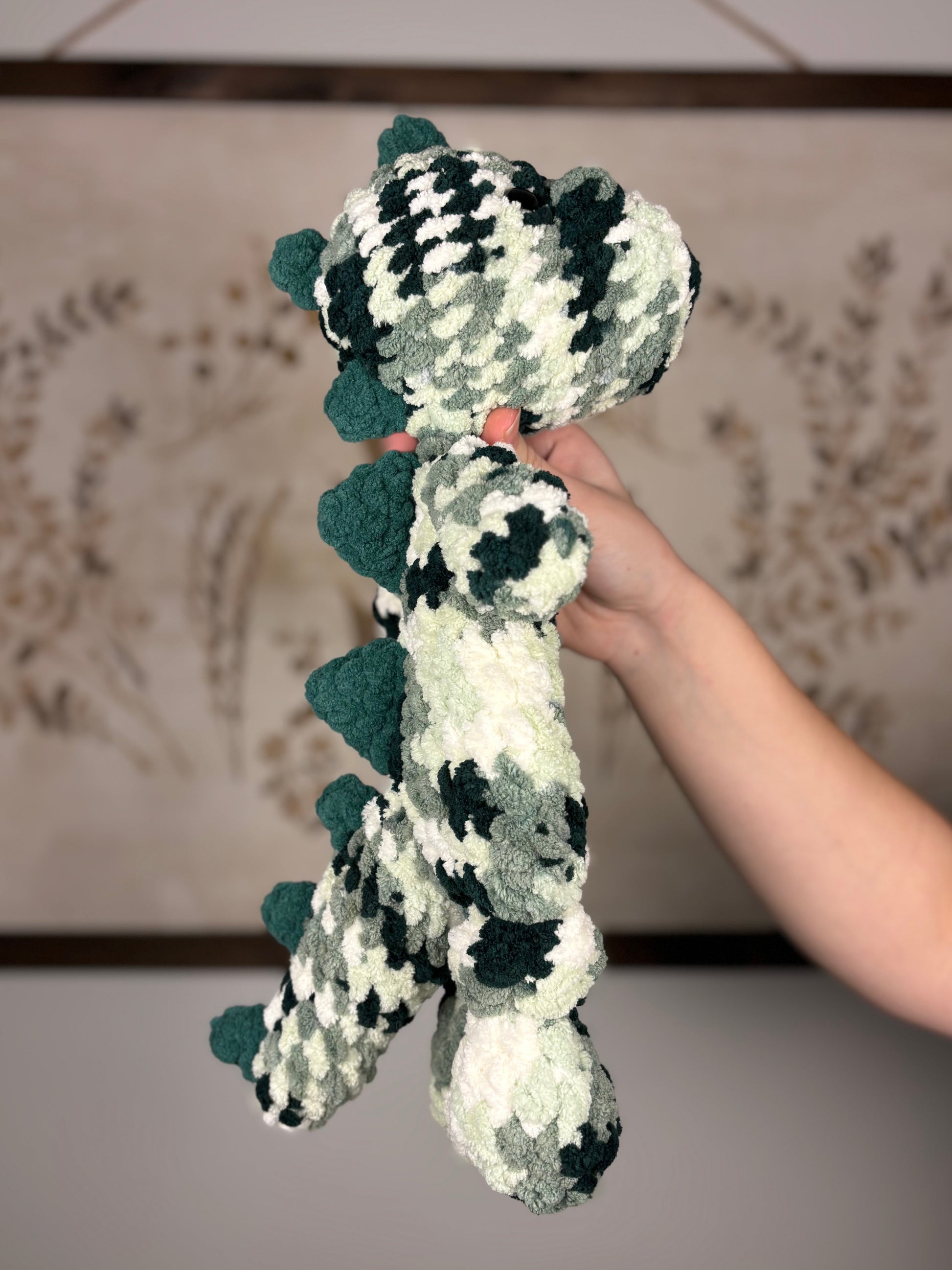 Large dinosaur snuggler measures approximately 18" tall