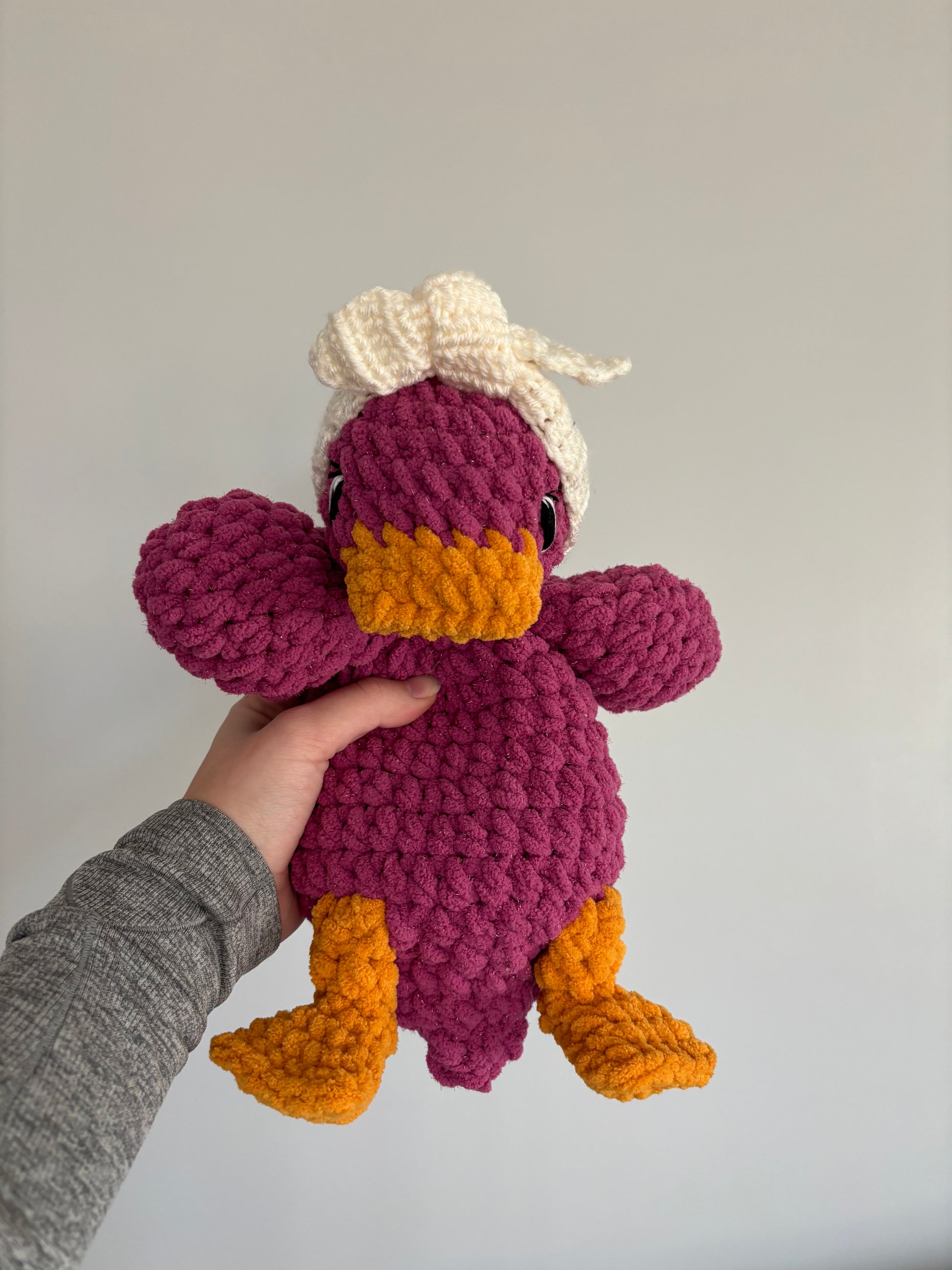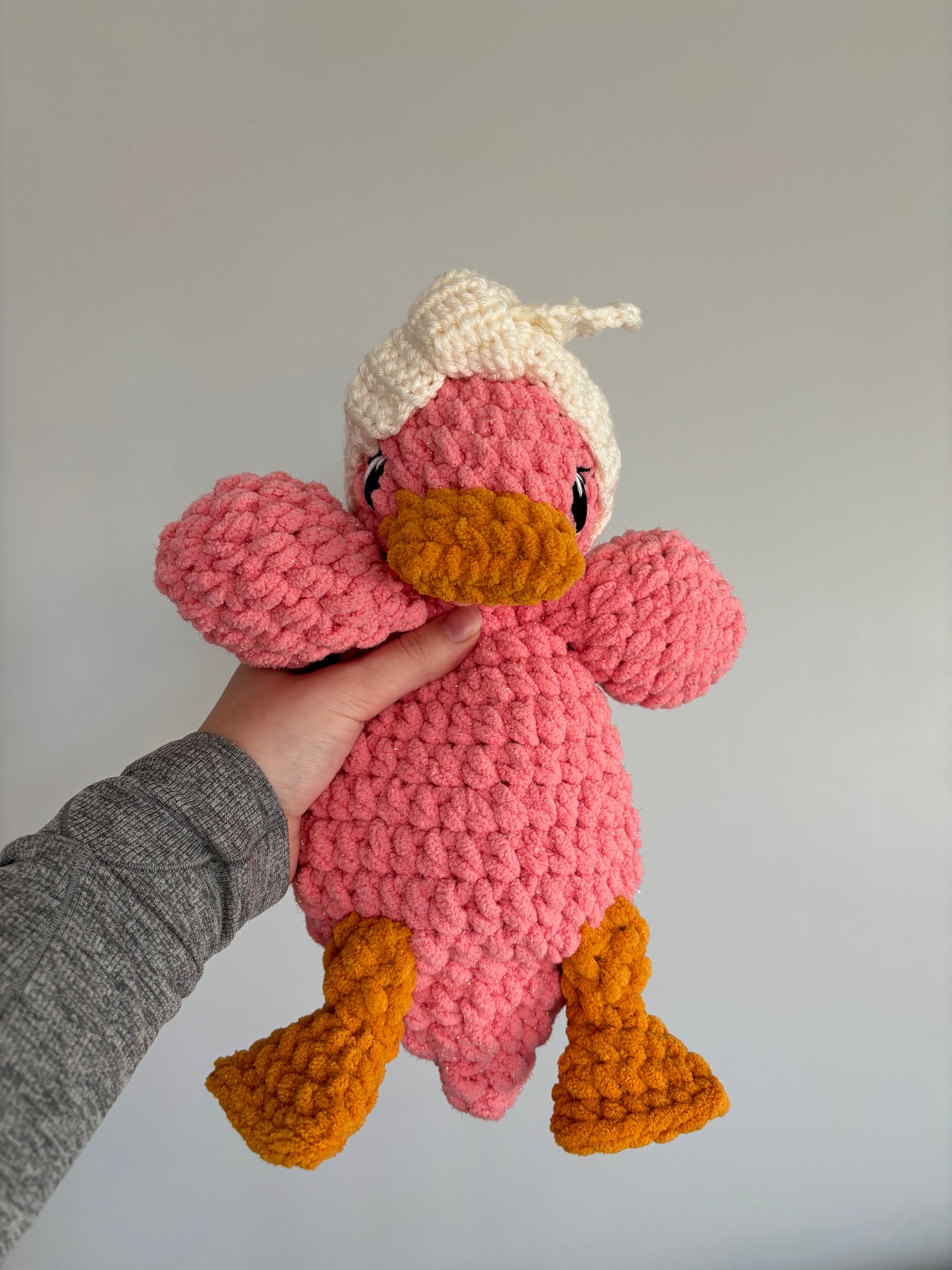 Meet Sparkly Della Duck, the sweetest snuggle companion around. Lovingly crocheted by hand, Della features a soft plush body, gentle textures, and her signature crocheted headband — a perfect blend of cozy charm and character. The sparkles add a touch of shine without impacting the softness.